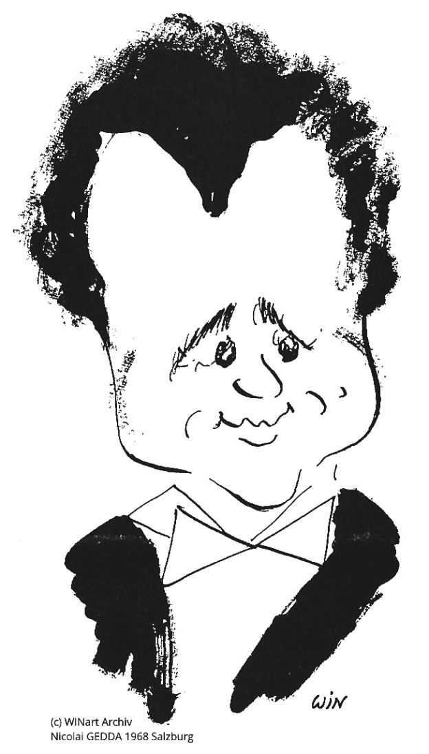 Mit Karajan und Salzburg verbinden Gedda sechs Opernauftritte und acht Konzerte. Im Zuge eines dieser Konzerte zeichnete die einzige österreichische weibliche Kulturkarikaturistin Prof. Winnie Jakob (1927-2012) ihn auch 1968 in Salzburg. Sie bezeichnete ihn als sehr feinfühlig und er war von Winnie‘s Karikaturen sehr angetan. Weitere WIN Karikaturen von GEDDA befinden sich im Original in den Archivsammlungen der Salzburger Festspiele.