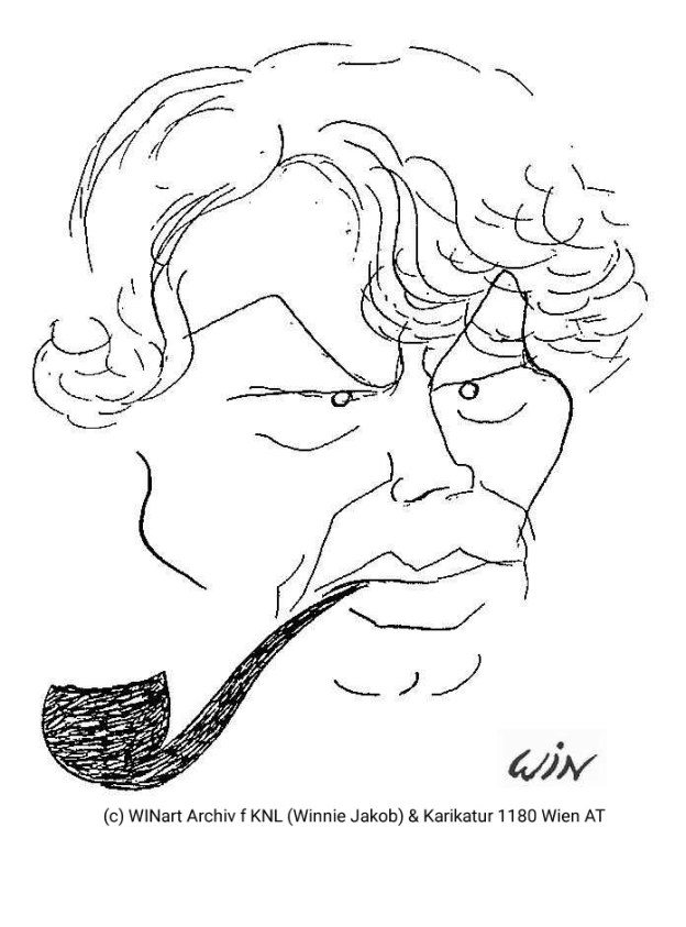 Meine Tante – die einzige weibliche österreichische Kultur Karikaturistin – Prof. WINnie Jakob (1927-2012) traf und zeichnete ihn öfters. Hier eine Zeichnung aus 1986 bei den Salzburger Festspielen aus dem WINart Archiv f Kunstnachlass & Karikatur eV NPO